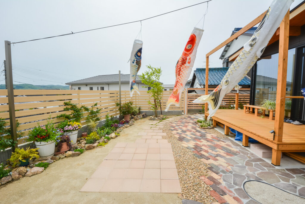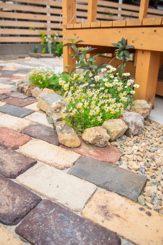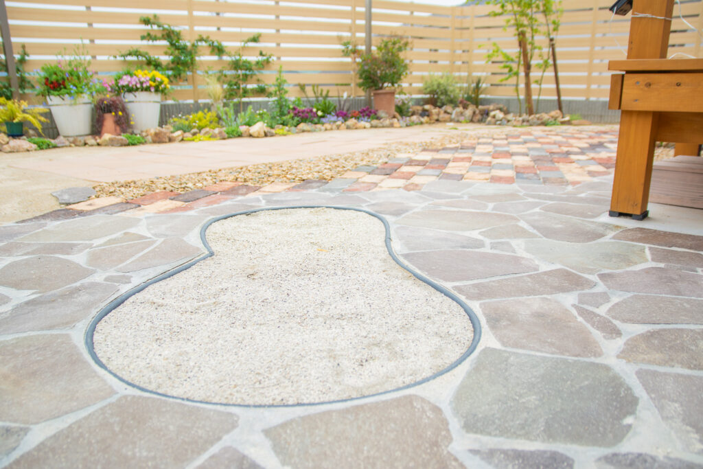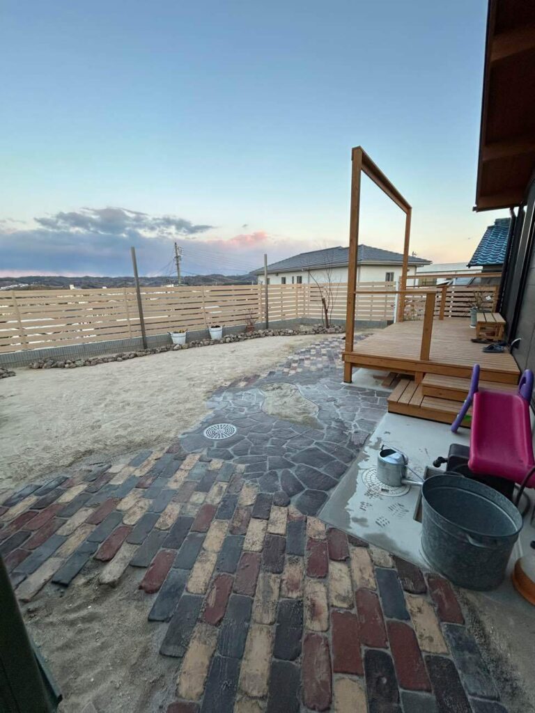 また、お子さんのための砂場もつくりました。周りを固めておくと砂が逃げても箒などで集めて戻しやすいですよ。