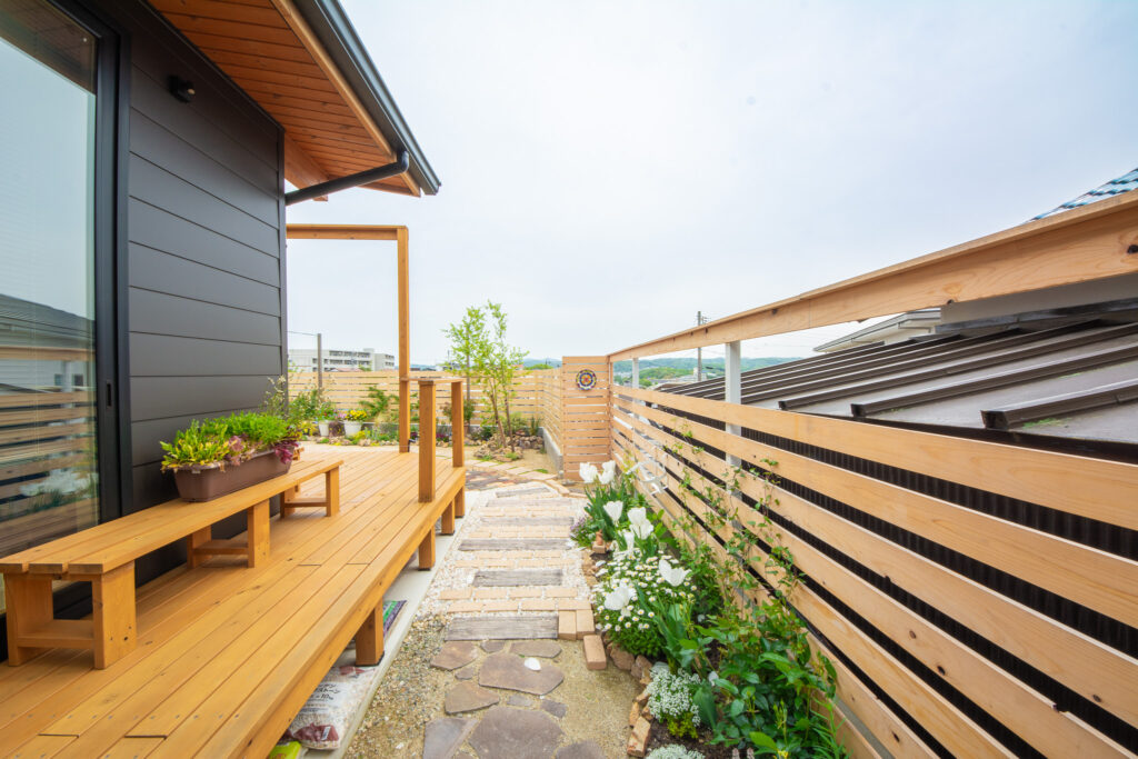 デッキ前にも小さく植えられる場所をつくりました。コンクリートの雰囲気をうまく中和してくれます。