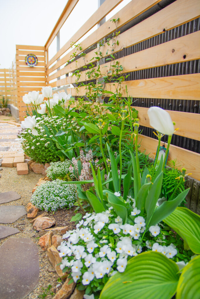お庭に向かうアプローチの脇には白い花を中心に植え付け。