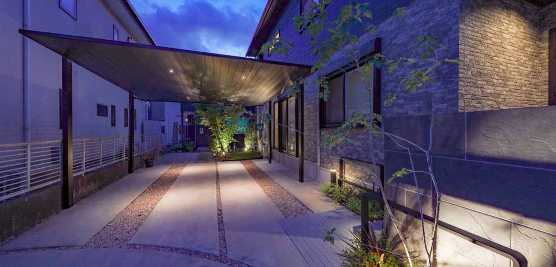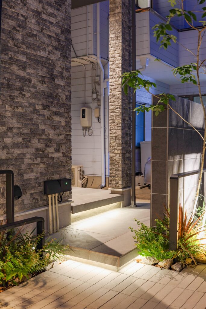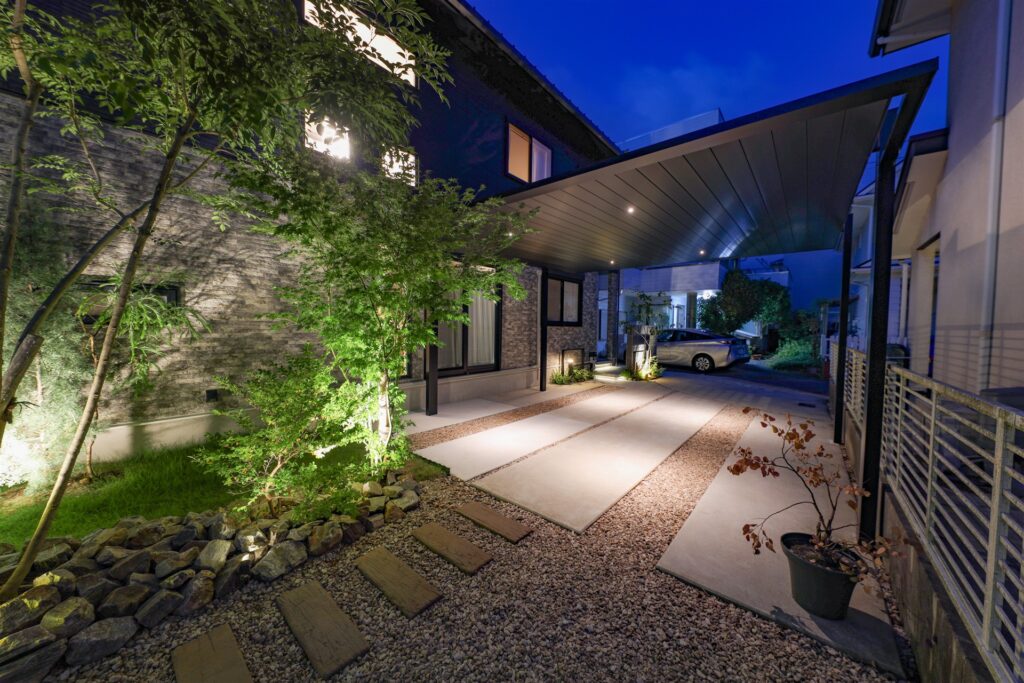 ライトアップにも力を入れ、植栽下や階段下、カーポートなどに配置し、夜になるとより素敵に輝くようにレイアウトしました。